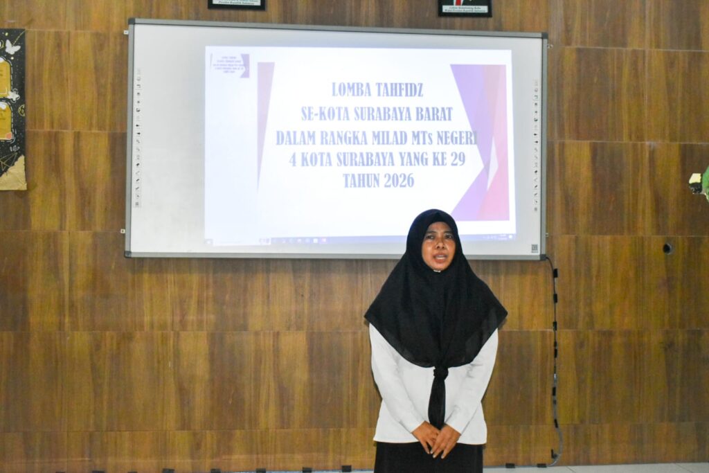 Surabaya, 24 Februari 2026 — MTsN 4 Kota Surabaya memulai Gebyar Milad ke-29 dengan penuh semangat di lingkungan madrasah. Hari pertama diisi dengan perlombaan tingkat SD/MI yang diikuti puluhan peserta kelas 6 dari berbagai sekolah dasar se-Surabaya. Kegiatan ini menjadi ajang mengasah bakat anak-anak dalam bidang literasi dan hafalan Al-Qur’an.
